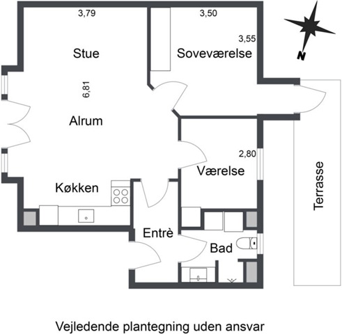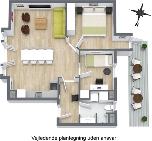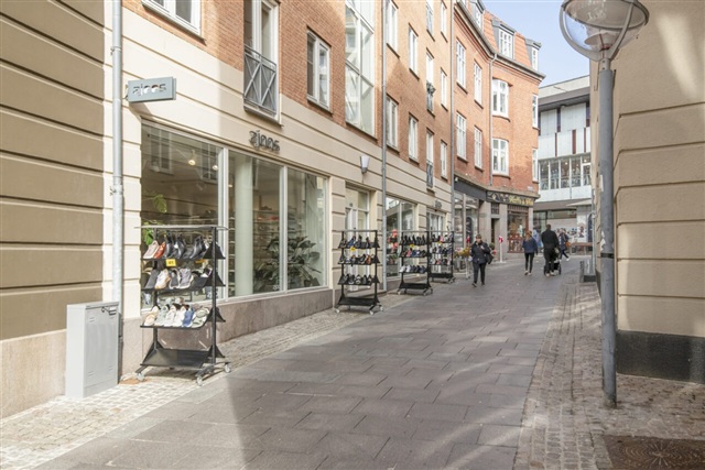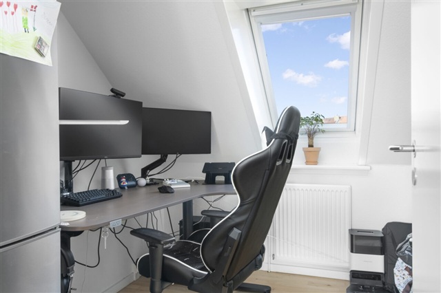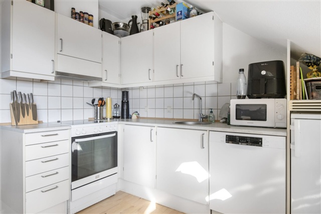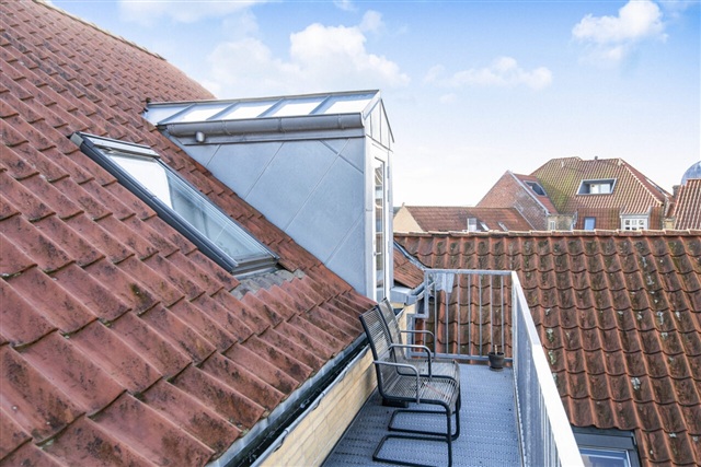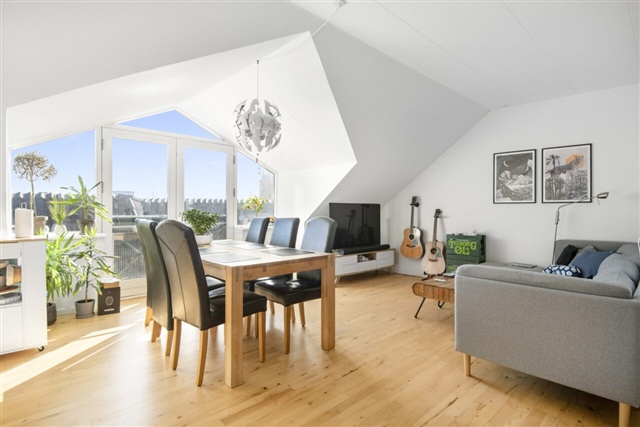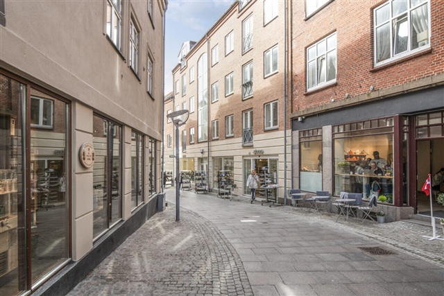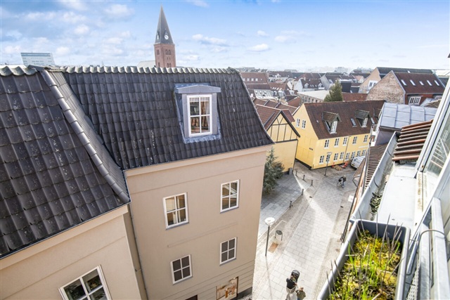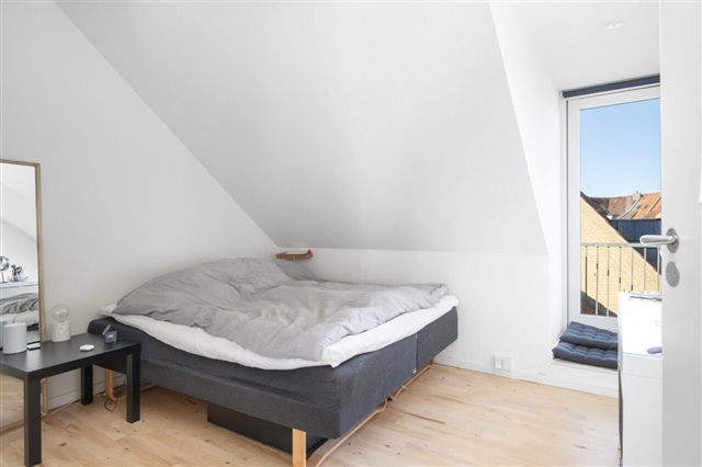 This apartment is situated on Møllegade, within walking distance to the many attractions offered by the city center. Residents benefit from close proximity to various shops, including Salling, as well as convenient grocery options, the harbor area, Friis, Magasin, and much more. Additionally, Mølleplads is just around the corner, known for its vibrant café culture during the summer months.Inside, the residence features a hallway with space designated for shoes and outerwear. The bathroom is equipped with both a washing machine and a dryer, along with a fixed mirror above the countertop and a shower stall. There is a smaller bedroom with built-in wardrobes, while the bright living room offers views over the rooftops of the city. The kitchen includes a refrigerator, dishwasher, stove, exhaust hood, and ample cabinet storage. The generously sized main bedroom contains fixed closets and opens onto a lovely covered balcony that can be used as a terrace. The floors consist of lacquered parquet, and the apartment will be handed over freshly painted.