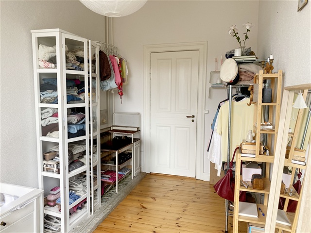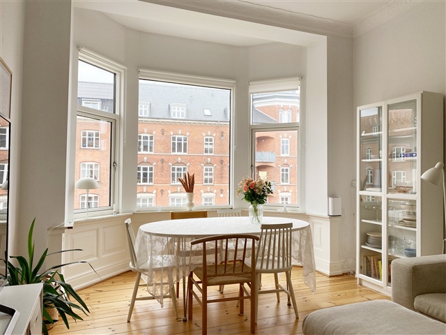 Situated on the second floor of Louisegade, this charming apartment offers a residence filled with character, natural light, and versatile layout possibilities. Combining traditional features with practical design, it suits individuals, couples, or those seeking shared living arrangements equally well.The home boasts a spacious and bright living room featuring a beautiful bay window that floods the space with daylight and creates a warm and inviting atmosphere. This area comfortably accommodates both a dining section and lounging space. Additionally, there is a second living room available, which can function as an extra lounge, home office, or bedroom depending on your needs.