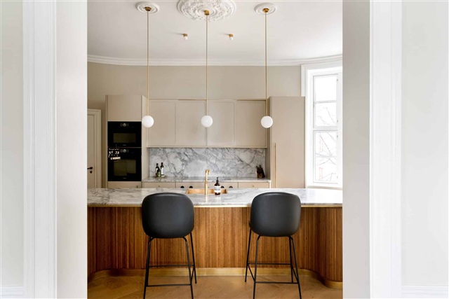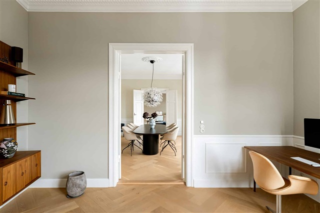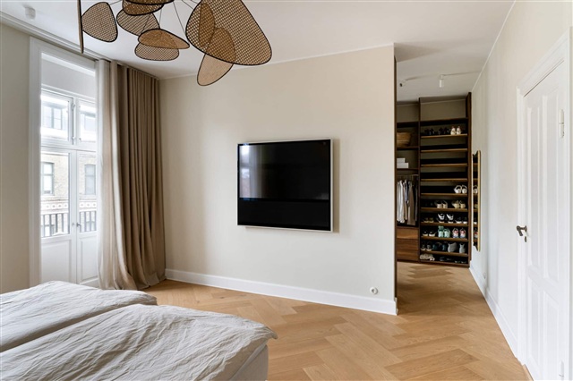 Located on the prestigious Frederiksberg Allé, this elegantly renovated apartment offers a generous 270 m² of living space. It occupies the entire third floor of a beautiful, well-maintained building and enjoys a peaceful yet central setting. Upon entering, you step into a hallway that leads directly to a stylish kitchen-dining area crafted by Københavns Møbelsnedkeri, distinguished by exquisite details like a built-in curved showcase. From here, you move into a spacious dining room, which connects through double doors to a large living room. The apartment features high wooden paneling, decorative stucco, and nearly all windows offer views down Frederiksberg Allé.The dining area also provides access to an office or additional bedroom. Leading from the kitchen-dining zone, a corridor connects to a large bedroom equipped with built-in wardrobes, and further on, an impressive master bedroom adjoined by a custom walk-in closet. The master suite has direct access to one of the two balconies. There are two luxurious bathrooms, one of which contains both a shower and bathtub, ample built-in storage, and a laundry unit with a countertop. At the hallway's end, there is a room currently utilized as a fitness area, which opens onto the second balcony.