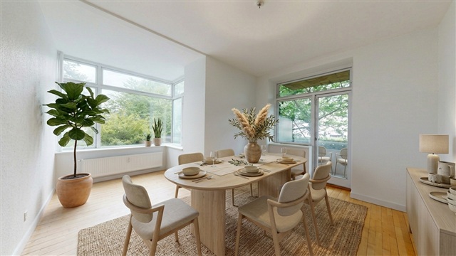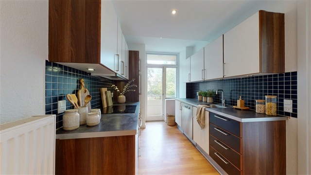 Located in Vesterbro, directly opposite the lively Aalborg Kongres and Kultur Center and just across from the stunning Kildeparken, lies the charming listed building known as Enighedslunden. Currently available for rent is a spacious and elegant four-room apartment within this lovely setting, featuring several bright and sunny balconies. Upon entering, you are welcomed by a large and generous hallway that leads into a central corridor, providing access to the apartment's various rooms. The kitchen is contemporary and stylish, equipped with sleek white cabinet doors, a large fridge-freezer, and a dishwasher. The living room offers ample space to accommodate both a sizable dining table and comfortable seating arrangements. From this roomy living area, one can step out directly onto a balcony that offers a pleasant view down towards the beautiful Ansgars Church. The apartment includes three bedrooms, all of which are bright and spacious. Two of these bedrooms have direct access to their own balconies. Additionally, there are two bathrooms in the apartment; the larger one contains a spacious shower cabin, a wall-mounted toilet, storage cabinets beneath the sink, and lighting incorporated into the mirror.