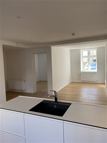 The property, which has served as Skanderborg Town Hall for many years, now provides the foundation for a new development. Through careful renovation and conversion, it has been transformed into 20 desirable residences situated in the heart of Skanderborg. These homes are designed for those who seek central living, with convenient access to shops, pharmacies, medical facilities, as well as the town's restaurants and cultural attractions all within walking distance.The project delivers contemporary apartments and practical homes, most offering step-free entry on a single level. The layout and design have been thoughtfully arranged to maximize living space and create comfortable environments. Inside, the apartments feature elegant lacquered oak floors. Kitchens and bathrooms are fitted with high-quality fixtures from JKE Design, including sliding doors on all continuous cabinets, premium appliances, wall-mounted toilets in the bathrooms, and additional quality elements.