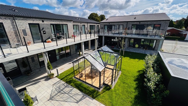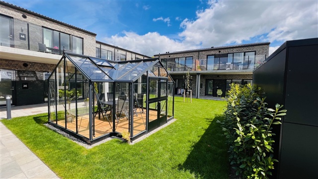 The outdoor environment includes shared green spaces featuring grass and wildflowers, a charming orangery, and a communal rooftop terrace-ideal settings for relaxation and socializing.