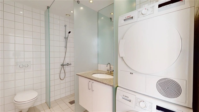 The bathroom is spacious and thoughtfully designed with ample storage options, including both a washing machine and a tumble dryer. Situated in Delta Park, Vallensbæk Strand, the neighborhood is characterized by a calm atmosphere and is conveniently close to nature as well as everyday amenities.