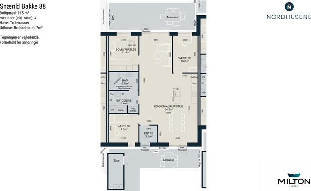 Upon entering the residence, one proceeds directly into a spacious combined kitchen and living area. This open-plan space is bathed in natural light thanks to large floor-to-ceiling windows and offers access to two separate terraces positioned on either side of the home. The contemporary kitchen occupies a central spot within the room, enabling interaction with family members while cooking. The layout provides ample opportunity for arranging a cozy living area along with a dining nook. Leading off from this central space are two bedrooms, a generously sized master bedroom featuring a built-in wardrobe wall, as well as a utility room and a bathroom.The property includes a private garden accompanied by a terrace, and there is a 7 square meter storage shed for tools and equipment. Parking is available in a shared area nearby. All utility expenses are billed directly to the tenant by the respective supply companies.