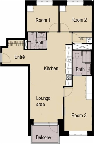 The apartment features modern wooden flooring throughout, complemented by expansive double-glazed windows that allow plenty of natural light to fill the space, along with central heating for comfort. It offers three separate bedrooms, while the kitchen and living area are combined into an open-plan design that includes both a dining section and a lounge area with a TV. In addition, there is one private storage room equipped with a washing machine and dryer. The unit has one shared bathroom, and the third bedroom benefits from a private ensuite bathroom. From the open kitchen and living room area, residents can step out onto a spacious, communal balcony. Outside, there is a pleasant green backyard that provides ample bicycle parking.Furnishings include a high-quality bed complete with a bedspread, duvet, and pillows. Each bedroom is equipped with a bedside table accompanied by a reading lamp, as well as a desk with an appropriate chair and a desk lamp. Storage is addressed with a wardrobe, a chest of drawers, and boxes placed under the bed. Additional items such as curtains, a mirror, a laundry basket, a trash can, rugs, and decorative elements are also part of the apartment's interior.