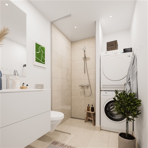On the ground floor, you will find a bright and welcoming entrance area with ample space for coats and shoes. The kitchen and dining area benefit from an open connection to the living room, creating a spacious environment. Additionally, there is an elegant bathroom equipped with storage solutions and a laundry column.