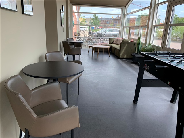 The accommodation is housed in the former Danica Hotel, which was renovated a few years ago by its new owner, the Hede Nielsen Family Foundation, whose founders are natives of Horsens. The foundation focuses primarily on supporting and distributing funds for cultural, scientific, social, and educational initiatives. Driven by a sustainable philosophy emphasizing recycling, many usable furnishings from the old hotel are freely available for residents' use. Consequently, each apartment is pre-furnished with a bed, small furniture items, and various kitchen utensils, making it easy and affordable for young students to settle in. Those who prefer not to use the provided furnishings may simply place them in the apartment's dedicated storage room.