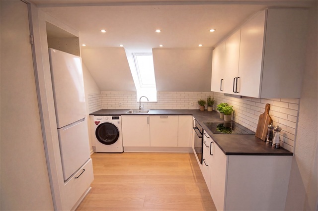 This apartment in Aalborg presents a bright and inviting living space, combining quality with a welcoming atmosphere. Perfectly suited for two students sharing, the residence is ready for immediate occupancy.Inside, you'll find a spacious living room alongside two well-sized bedrooms, complemented by a newly remodeled kitchen and bathroom. The entire unit has undergone comprehensive renovation, featuring fresh flooring throughout that enhances the bright and cohesive ambiance. The kitchen is designed for practicality, offering ample countertop space and fitted with a dishwasher, washing machine, and dryer. The bathroom is finished with light materials and includes underfloor heating, contributing to a comfortable and slightly luxurious feel.