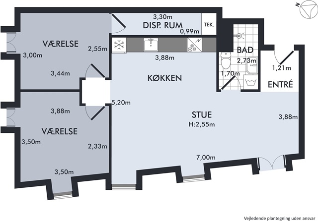 In the middle of Køge's vibrant center you will find this modern 82 m2 apartment, which offers ready-to-move-in settings and an everyday life with maximum convenience. Here you live a few steps from the station, green areas and the city's many offers, all gathered in a contemporary building from 2021.INTERIOR The apartment offers a well-thought-out floor plan, where light materials and functionality go hand in hand. The three rooms in total are divided into two good bedrooms and an open living room, which combines the living room and kitchen in one. Here, daylight streams in through large windows and creates a pleasant feeling of space characterized by calm and modernity. The kitchen is built in a simple, stylish design with integrated cabinets and good workflows, ideal for those of you who want an easy and practical everyday environment. The bathroom is decorated in modern materials and has an optimal use of the square meters, including a practical sink column. The light walls and the continuous, matt-lacquered wooden floor tie the apartment together and create an inviting expression. The layout provides space for both family life, a home office or a guest room and is aimed at those of you who want flexible settings in the middle of the city.