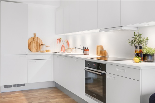 Within the Poppelhuset development, residents can enjoy cooking in a contemporary kitchen by Svane, featuring the Vision model characterized by sleek white cabinetry, ample storage options, and a refined Grohe faucet. Siemens appliances ensure top-tier quality in this unit, including a combined refrigerator and freezer, an integrated dishwasher, a built-in stainless steel and glass oven, and a four-zone induction cooktop with Touch Control technology. Additionally, a Silverline brand extractor hood is seamlessly integrated into the overhead cabinet.