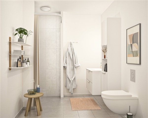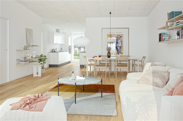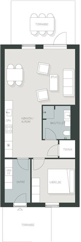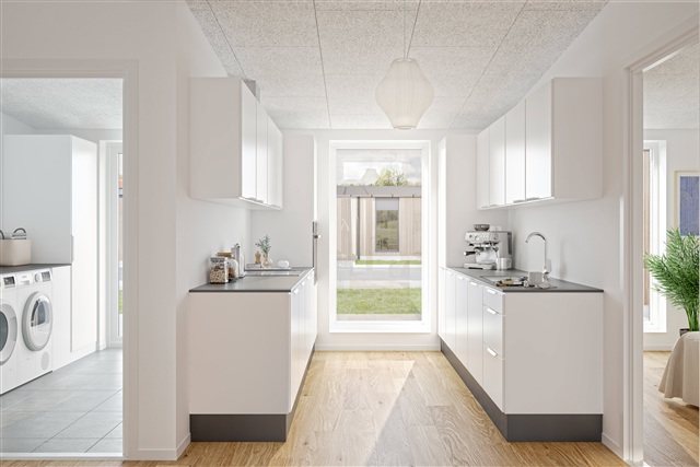 If you are considering exchanging your apartment for a townhouse, looking to replace your permanent residence with a rental, or searching for a first home to share as a couple, this two-room townhouse presents a compelling option. Situated in Stenlille, this newly constructed, energy-efficient townhouse offers modern living with thoughtful design.Upon entering the property, you are greeted by a functional hallway featuring an attractive gray tile-look floor. This area includes a washer and dryer column as well as ample storage space for coats and shoes within built-in white cupboards, which continue through the bedroom and bathroom. The entire home is equipped with underfloor heating and a ventilation system that contributes to a comfortable indoor climate.