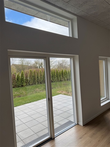 Moving beyond the entrance, you find a spacious combined kitchen and living room area. The kitchen boasts a timeless white design from HTH and is fully fitted with all necessary appliances. Large windows provide expansive views of the surrounding greenery, filling the space with natural light.