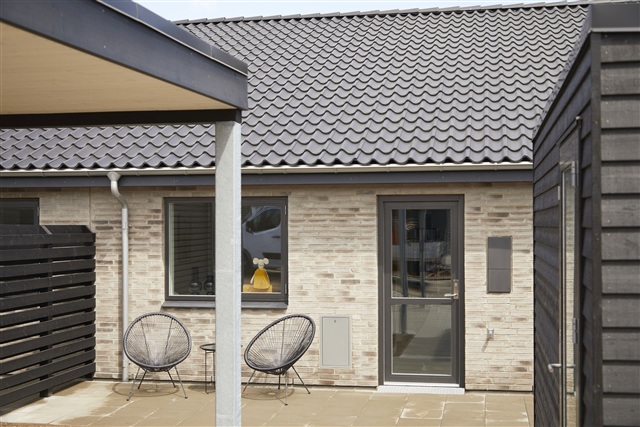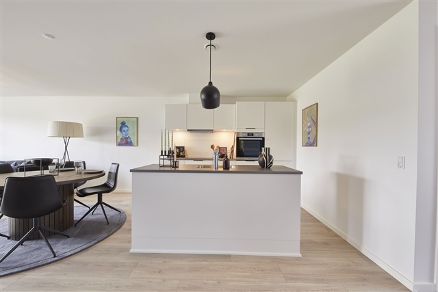 These homes are designed as open and bright terraced houses with white, smooth ceilings and walls throughout, creating a light and welcoming atmosphere. The windows are generously sized to maximize daylight in every room. Flooring in the kitchen-dining area, living room, and bedrooms consists of oak plank laminate, while entrance, utility room, bathroom, and shower areas are outfitted with stylish dark gray tiles. All doors have a smooth white finish with stainless steel handles and are installed without doorsteps for easy movement. Window sills are constructed from masonry and finished with white plaster, and the walls meet the floors with white, smooth baseboards.
