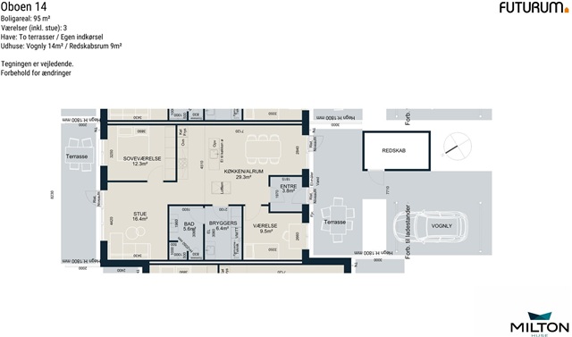 The property features a spacious and inviting kitchen-dining area equipped with a contemporary kitchen that includes a kitchen island and a dining space. This room benefits from abundant natural light streaming through a large window section paired with a patio door leading to the terrace situated at the front of the home. Adjacent to the kitchen, an open-plan, cozy corner living room also features a wide window façade and access to a substantial terrace located at the rear, creating seamless indoor-outdoor flow. Additional rooms comprise a separate entrance hall, one bedroom, a utility room with laundry facilities, a bathroom, and a large master bedroom complete with a built-in wardrobe wall.The residence includes a private garden and terrace area. Outbuildings consist of a 9 m² garden shed. Parking is available with one designated space next to the home, which also includes a carport. All utility costs are billed directly to the tenant by the service providers.