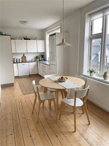 This apartment offers a refined blend of sophistication and vibrant city life situated in the center of Aalborg. It is ready for immediate occupancy and provides a cozy and welcoming environment.Upon entry, you are greeted by a bright hallway that leads into a spacious living room where ample natural light pours through tall windows. The classic details combined with solid wooden floors contribute to an enduring charm, making this residence suitable both for couples and for those seeking shared living arrangements. Three well-sized rooms are available, flexible enough to serve as bedrooms, an office, or a creative workspace depending on personal requirements.