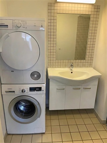 The kitchen is designed to be both practical and generous in size, fitted with modern appliances including a dishwasher that simplifies daily routines. The bathroom is efficiently planned and equipped with both a washing machine and a tumble dryer, providing convenience for everyday household tasks.