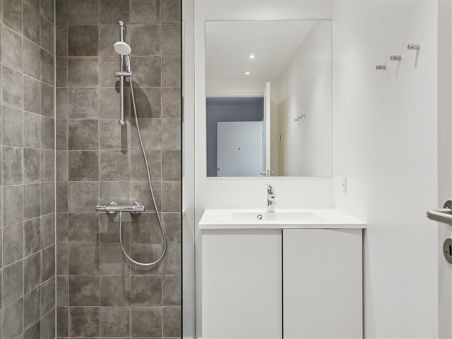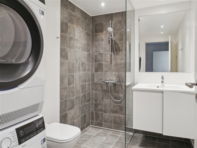 The bedroom offers a comfortable size, easily accommodating a double bed. The bathroom is well-appointed and prepared for the installation of both a washing machine and a dryer.