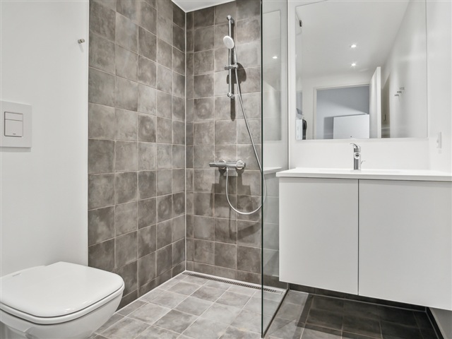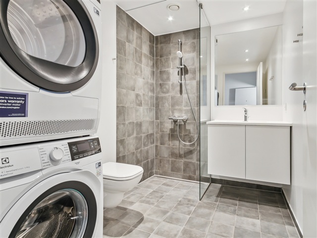 The bedroom is generously sized, providing enough room for a double bed. The bathroom is designed to be stylish, with preparations made for the installation of a washing machine and dryer.