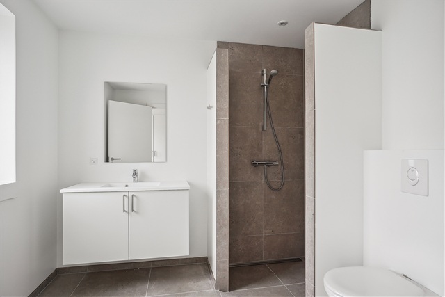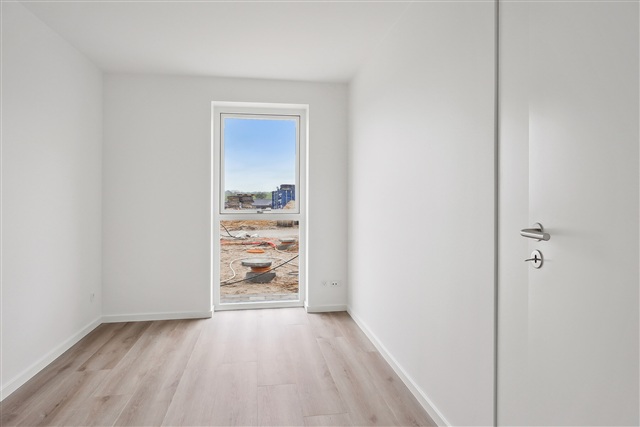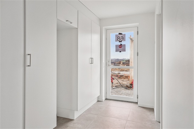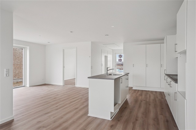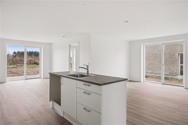 A contemporary and thoughtfully designed 3-room townhouse spanning 95 m² is available for rent in the scenic area of Eltang, situated just 7 kilometers from Kolding. This residence is part of a development completed and ready for occupancy as of April 1, 2025.Constructed on a single level, the home offers a well-planned layout that maximizes the use of every square meter. Upon entering, you are greeted by a practical entrance area combined with a utility room, featuring ample storage within white cabinetry and provisions for a washer and dryer setup. The heart of the house is the spacious open-plan kitchen and dining area located centrally, providing a versatile space accommodating both a dining table and a seating arrangement. The kitchen impresses with sleek white Svane fittings and integrated appliances, complemented by a kitchen island that serves as additional workspace and defines the room's layout. Natural light streams in from multiple directions, creating a bright and inviting atmosphere in this large living space.