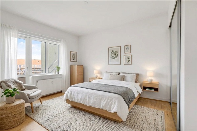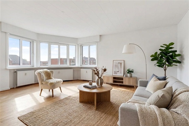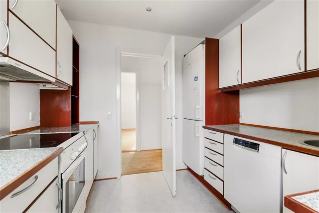 This spacious and well-maintained apartment encompasses 122 square meters and is filled with natural light streaming through large window sections, creating a comfortable living atmosphere. The layout is designed for everyday use, featuring an entrance hall and corridor that lead to two elegant en suite living rooms, both providing ample space for a dining table as well as a seating area. Additionally, there are two versatile bedrooms, a practical kitchen, and a neat bathroom. Throughout the apartment, continuous plank flooring and bright walls contribute to a calm and airy ambiance, with one of the bedrooms equipped with built-in wardrobes offering convenient storage solutions.The kitchen is efficiently organized with generous cupboard and countertop areas, fitted with essential appliances such as a dishwasher, stove/oven, extractor hood, and a tall cabinet housing the fridge and freezer. The bathroom is tiled in light colors and includes a shower cubicle, spot lighting, and a towel radiator, combining simplicity with daily functionality. One of the bedrooms opens onto a cozy balcony that overlooks a peaceful courtyard space, providing room for a small café table and a green plant.
