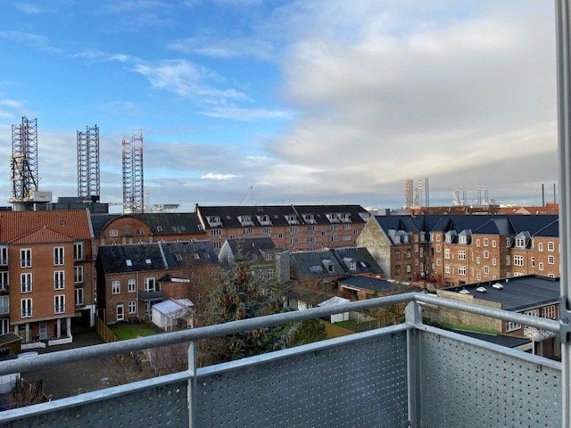 Situated at the top of a traditional brick building, this penthouse apartment offers bright and thoughtfully arranged living spaces. Positioned above the city's rooftops, it includes a private balcony that provides a lovely water view toward the harbor, allowing both sky and scenery to be enjoyed throughout the day.Upon entering, the apartment welcomes you with a practical hallway equipped for coats and shoes, leading onward to a kitchen bathed in natural light. The kitchen features a clean, modern design with white cabinetry contrasted by a dark countertop and comes complete with essential appliances: dishwasher, oven, stove, and a combined fridge/freezer. There is ample room here for a dining table, making it an ideal spot for both cooking and socializing.