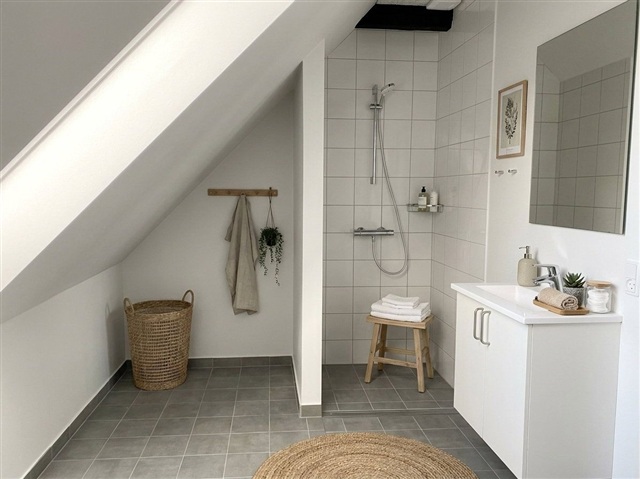 The living area is spacious and inviting, characterized by sloped walls, large windows, and skylights that fill the room with natural brightness. Exposed beams and consistent light wood plank flooring contribute to a warm and serene atmosphere that lends itself easily to personalized interior styling. The bedroom enjoys a tranquil setting and grants direct access to the balcony, perfect for savoring morning coffee outdoors. It is designed with flexibility in mind, offering sufficient wall space to accommodate wardrobes. The bathroom is tidy and practical, equipped with a shower niche, tiled floor, and storage space under the sink, supporting everyday convenience.