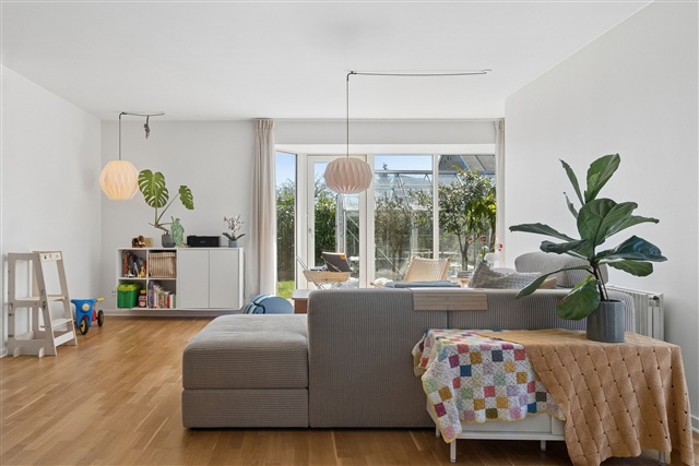 This inviting single-story villa is situated in a tranquil, elevated location at the end of a quiet cul-de-sac, offering minimal traffic and a picturesque view over the rooftops of Aarhus. The neighborhood enjoys considerable popularity among families with children, providing a safe environment, friendly neighbors, and convenient proximity to schools, shopping, and the wide range of amenities Aarhus has to offer.Access to the property is via a gently sloping driveway leading to a shed that provides ample storage space. Additionally, there is potential for installing an electric vehicle charger on the premises. Upon entering the home, you arrive in the entrance hall featuring underfloor heating and practical access to the rest of the residence. Alternatively, there is a separate entrance through the recently renovated utility room (2025), which is bright, functional, equipped with laundry facilities, and offers generous countertop space-ideal for everyday use.