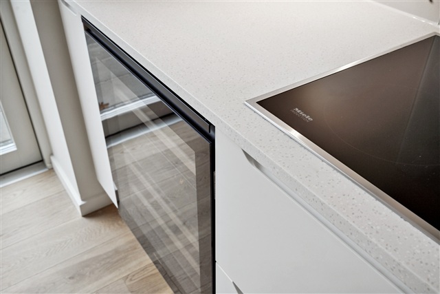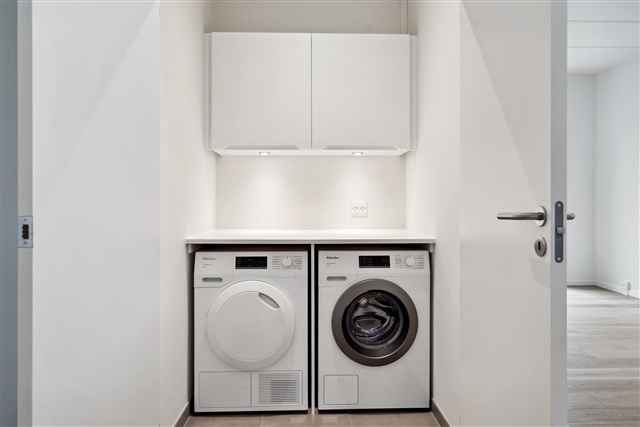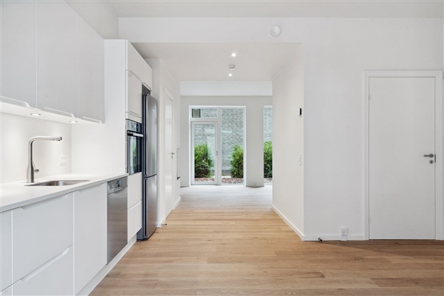 Situated within the desirable Munkebjerg Park, this attractive four-room townhouse spanning 125 m² is available for rent. The property is arranged over two floors. Upon arrival, you are greeted by a spacious and practical terrace, which also provides access to a storage shed.Upon entering the house, you step into a large, stylish kitchen and dining area featuring a high-end Designa kitchen. The cabinetry is matte white, complemented by elegant Corian countertops. All appliances are from Miele, including a combined fridge-freezer, dishwasher, built-in oven, an 80 cm induction cooktop, and an upscale wine cooler. The kitchen is generously sized, ideal for accommodating a large family or guests, and is open to the living room. From the kitchen, you walk into an expansive living space that boasts a beautiful gas fireplace by Living Flames and access to a wooden terrace.