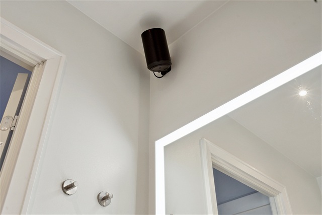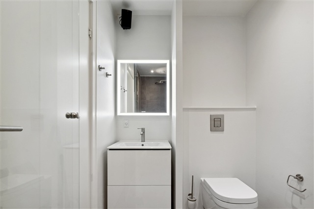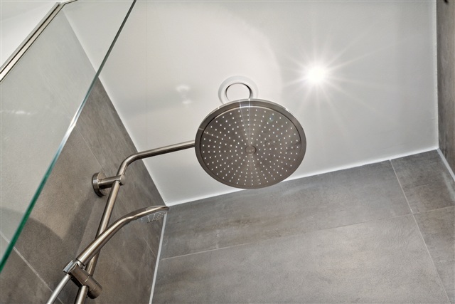On the ground floor, there is a sizeable bathroom fitted with a large sink unit that includes spacious drawers and cabinetry from Duravit. Above the sink hangs a large illuminated mirror, and in one corner of the bathroom, a SONOS speaker is installed. The shower enclosure includes a luxurious Grohe rain shower. Additionally, a water softening system reduces the hardness of the water throughout the home.