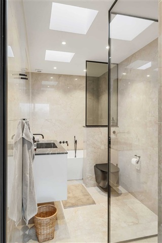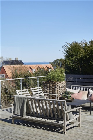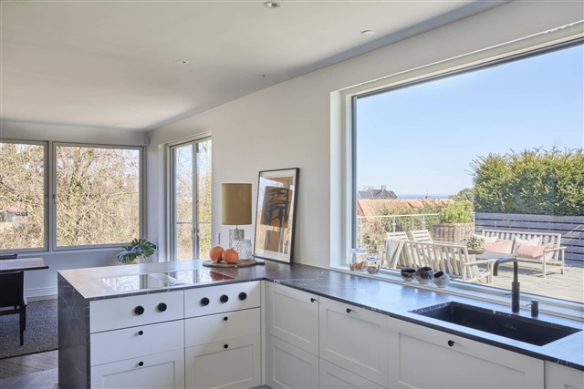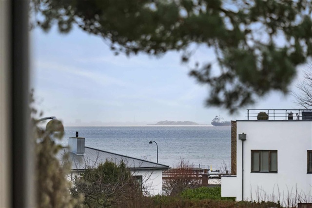 Situated in Klampenborg-Skovshoved on Rosavej, this beautifully renovated villa offers stunning views of the Øresund. The property occupies an elevated plot of 1,418 square meters, providing a sunny and private garden space with several terraces that also overlook the water. Upon entering, you are greeted by a spacious, bright hallway featuring built-in closet space and the first of the home's three bathrooms.The custom-designed kitchen is bright and airy, enjoying views of the sea and including a large temperature-controlled wine room. It flows openly into the dining area, which offers access to an east-facing wooden terrace. From the kitchen and dining space, you step into the expansive living room. This room benefits from a south-facing glass façade with sliding doors that open onto a charming, secluded garden with a stone terrace where evening sun can be appreciated. A fireplace adds warmth to the living area.