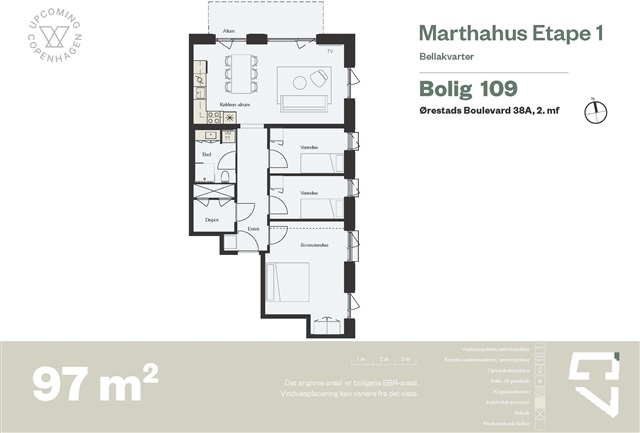 Situated on the second floor, apartment number two to the left, along Ørestads Boulevard, this residence in the Bellakvarter area offers a contemporary and inviting living space. Characterized by abundant natural light and a thoughtfully designed layout, the home blends aesthetic appeal with practical use. The apartment features a spacious bedroom that comfortably accommodates both a bed and wardrobe, along with additional rooms suitable for use as children's bedrooms, a home office, or guest accommodations.Upon entering, one is met with a sleek bathroom finished with modern materials, including a separate shower area and a dedicated laundry column. The central hub of the residence is the bright kitchen and living area combined in an open-plan arrangement. The kitchen is equipped with built-in appliances such as a dishwasher, fridge/freezer, oven, stovetop, and extractor hood. This space flows seamlessly into the living room, which provides ample room for a dining table and seating area. From the living room, access is granted to a cozy balcony. Additionally, the apartment comes with a convenient storage room located inside.